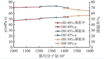 室內(nèi)通過控制水解度(40%~50%)制備了一系列的SRY-1樣品,配制成濃度為0.5%的溶液,測試聚合物不同分子量下的表觀黏度(30 min)和降阻率(Q=45 L/min)。如圖2所示,在優(yōu)化的水解度范圍內(nèi),SRY-1分子量均在1000萬以上,水解度越高,分子量越高;溶液表觀黏度隨分子量的增大而增大,但降阻率隨分子量的增大呈現(xiàn)先緩慢升高后較快降低的趨勢。主要是因為分子量越高,重復單元數(shù)愈多,分子間越易形成鏈纏結,分子鏈具有更大的流體力學體積,溶液黏度增大,當增大到一定范圍,溶液黏彈性受到影響,降阻率就隨之下降。由數(shù)據(jù)對比,SRY-1分子量控制在1200~1300萬為宜。