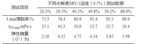 數(shù)據(jù)顯示,隨水解度增大,SRY-1增黏率和表觀黏度都顯著提高,但水解度超過60%后,增黏率又有所降低,SRY-1溶液G'呈現(xiàn)先增大后減小的趨勢。分析認為:在一定范圍內(nèi),由于水解度增大,分子鏈更加伸展,分子間共價鍵作用更易形成彈性微觀網(wǎng)絡結構,彈性模量G'增大;隨著水解度繼續(xù)增大,聚合物分子流體力學體積持續(xù)增大而很難交叉纏繞,黏性行為明顯,彈性減弱,表現(xiàn)為彈性模量G'減小。因此水解度過度提高會造成增黏率下降,溶液黏性增強,彈性降低的負面影響。由數(shù)據(jù)可知,SRY-1水解度為40%~50%時,SRY-1的3 min增黏率可達90%以上,溶液黏彈性最為顯著。