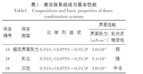 界面張力按照設(shè)定濃度分別配制超低界面張力、乳化和雙效復合體系(表1),在70°C下利用界面張力儀,測試其與目標稠油的界面張力。