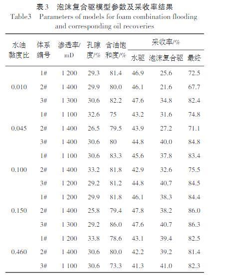 隨著水油黏度比的增大,3種泡沫復(fù)合體系采收率增幅的差異逐漸減小,水油黏度比界限為0.150:①當水油黏度比小于該界限,分別為0.010,0.045和0.100時,1#超低界面張力泡沫復(fù)合體系驅(qū)油采收率增幅分別為25.6%,31.6%和37.8%;2#乳化泡沫復(fù)合體系驅(qū)油采收率增幅分別為21.6%,27.2%和32.6%,較1#采收率增幅低,1#超低界面張力泡沫復(fù)合體系驅(qū)油效果強于2#乳化泡沫復(fù)合體系,后者不能替代前者;3#雙效泡沫復(fù)合體系驅(qū)油采收率增幅分別為34.8%,40.0%和40.7%,較1#高9.2%,8.4%,2.9%;可見,在超低界面張力基礎(chǔ)上增強體系乳化性能,能夠明顯改善驅(qū)油效果。
