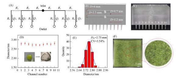 在確定平行放大微流控器件通道結(jié)構(gòu)尺寸設(shè)計后,通過SolidWorks建立三維模型,并利用光固化3D打印機直接打印微流控器件。實驗表明,10個并排微流控通道均可以穩(wěn)定生成水/水微囊,并且所生成的微囊具有較一致的尺寸大小和較均勻的分散性。綜合統(tǒng)計10個微流控通道形成的微囊分布,可以得到D=(2.75±0.10)mm.在10個平行微流控通道設(shè)計下,水/水微囊的產(chǎn)率可以達(dá)到0.5 kg/h,并可依據(jù)相同原理,進一步增加平行通道的數(shù)量,提高產(chǎn)率,實現(xiàn)尺寸均一水/水微囊的高通量制備。