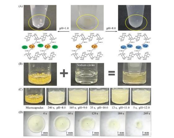 所制備的水/水微囊具有良好的生物相容性、尺寸均一性及較高的包裹率和裝載率,是各種活性物質(zhì)的理想載體,并且能夠?qū)H變化做出響應(yīng),實現(xiàn)可控釋放。如圖5(A)所示,水/水微囊的殼層是由二價鈣離子交聯(lián)的海藻酸鈉水凝膠組成,在酸性環(huán)境下具有良好的穩(wěn)定性,但在堿性環(huán)境下海藻酸鈉水凝膠與二價鈣離子的結(jié)合能力變?nèi)酰宦?lián)網(wǎng)絡(luò)被破壞,從而釋放內(nèi)核活性物質(zhì)。如果在溶液中加入檸檬酸鈉,二價鈣離子更傾向于與檸檬酸根結(jié)合,從而破壞交聯(lián)網(wǎng)絡(luò),也可以溶解水/水微囊。如圖5(C)所示,水/水微囊的溶解速率隨pH的增大而提高。當(dāng)水/水微囊的囊壁被溶解后,內(nèi)核物質(zhì)逐漸被釋放出來,展現(xiàn)出良好的pH響應(yīng)性和可控釋放。