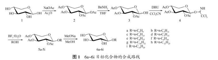 采用全乙?;哪咎?2)在四氯化錫催化下與一系列脂肪醇發(fā)生偶聯(lián)反應(yīng),對時間要嚴格控制,否則有部分轉(zhuǎn)化成α-異構(gòu)體,當時間過長時,還會形成以α-糖苷為主的產(chǎn)物和少量2-位脫保護的糖苷副產(chǎn)物。參考烷基-β-D-葡萄糖苷等合成與性能研究成果,按照Scheme1所示的路線,以D-木糖(1)為原料通過乙?;⒚?-位乙?;?、與三氯乙腈反應(yīng),得到相應(yīng)的三氯乙酰亞胺酯(4)。采用易于構(gòu)筑1,2-反式糖苷鍵的三氯乙酰亞胺酯法,以三氟化硼乙醚作糖苷化偶聯(lián)反應(yīng)的催化劑,使得具有鄰基參與效應(yīng)的三氯乙酰亞胺酯(4)與相應(yīng)的脂肪醇反應(yīng)及相應(yīng)的脫乙?;Wo,合成一系列烷基-β-D-吡喃木糖苷,如圖1所示。本文作者對其溶解性、表面張力、乳化性能、液晶性能、熱穩(wěn)定性等理化性質(zhì)進行研究。
