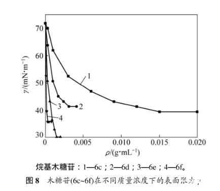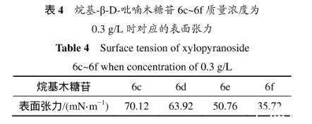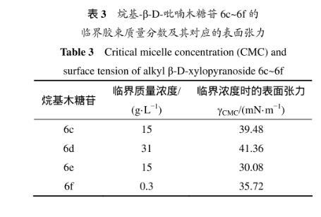 表3所示為烷基-β-D-吡喃木糖苷6c~6f的臨界質(zhì)量分?jǐn)?shù)及所對(duì)應(yīng)的表面張力。溶液表面的吸附量達(dá)到飽和時(shí)(剛好飽和時(shí)的濃度即為臨界濃度),表面張力最小。從表3可以看出:辛基-β-D-吡喃木糖苷(6e)達(dá)到臨界濃度時(shí)對(duì)應(yīng)的表面張力是最低的,能力最強(qiáng)。因?yàn)橥榛咎擒盏谋砻婊钚允怯善溆H水糖基和疏水烷基鏈共同決定,當(dāng)烷基鏈長(zhǎng)為=8(糖苷6e)時(shí),親水性和疏水性達(dá)到最佳平衡,表面張力最低。