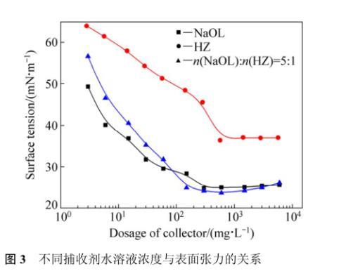 表面張力是影響浮選過程中氣泡的穩(wěn)定性,以及氣泡形成難易程度的主要參考數(shù)據(jù),臨界膠團(tuán)濃度(簡稱CMC)是反映表面活性劑降低水溶液表面張力的效率。組合用藥的浮選效果優(yōu)于單一用藥,這可能與其在水溶液中的表面張力有一定的關(guān)系。圖3所示為最佳pH條件下(pH=9.0)組合捕收劑與兩種單一捕收劑的水溶液濃度與表面張力的關(guān)系。NaOL在水中微量的添加顯著地降低了水的表面張力,而隨著NaOL濃度的增加,溶液的表面張力逐漸下降,在濃度為302 mg/L時(shí)溶液的表面張力達(dá)到最低,為22.7~24.8 mN/m。此后NaOL濃度的增加并不能顯著地降低水的表面張力,所以可以確定NaOL的CMC值約為302 mg/L,與文獻(xiàn)中報(bào)道的1.03×10?3mol/L(308 mg/L)接近。而HZ的CMC值568 mg/L,表面張力36.37 mN/L。作為一種表面活性劑,其表面活性明顯不如NaOL,在較高濃度下,HZ才能形成膠團(tuán)。浮選HZ用量為200 mg/L,低于其CMC值,在此濃度下,膠團(tuán)未形成,表面張力較高,起泡性不佳,在單礦物浮選試驗(yàn)中表現(xiàn)出了泡沫量小的特點(diǎn)。組合捕收劑水溶液的表面張力測試結(jié)果表明,CMC值約為150 mg/L,CMC值下水溶液表面張力為24.88 mN/m??梢奌Z的添加能降低NaOL的CMC值,這可能是NaOL作為一種陰離子型表面活性劑,親水“離子頭”之間的靜電作用較強(qiáng),非離子表面活性劑的“插入”到親水“離子頭”之間,同時(shí)亞氨基也存在一定程度的解離,使得離子之間的靜電斥力減小。