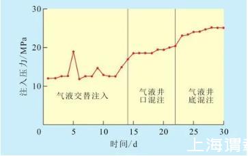 在氣液井口混合注入階段,當(dāng)氣液比為0.5∶1時(shí),注入壓力由氣液交替注入階段末期的17 MPa上升到18.5 MPa;當(dāng)氣液比升至0.75∶1時(shí),注入壓力逐漸升至20.3 MPa。