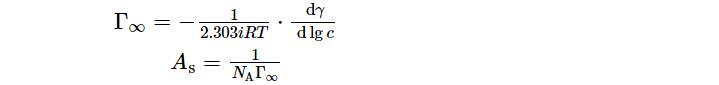 為了更全面地研究表面活性劑溶液性質(zhì),采用Gibbs吸附公式建立了表面吸附量和表面張力及活度之間的關(guān)系,根據(jù)表面活性劑表面張力變化曲線,可利用其得出表面飽和吸附量(?!蓿捎诒砻婊钚詣┤芤簼舛群苄?,趨近于稀溶液,其活度可約等于濃度。再通過與阿伏伽德羅常數(shù)的數(shù)量關(guān)系,計算每個吸附分子在溶液表面所占的平均面積(AS)。因此可由如下公式計算: