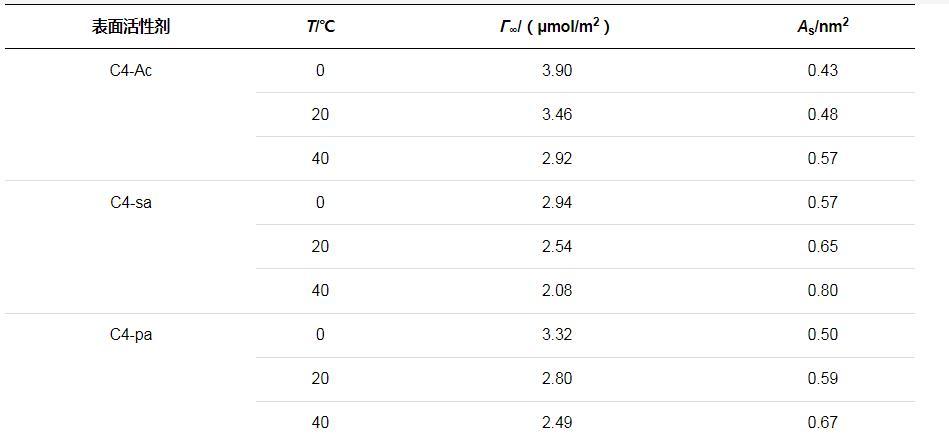 通常較高的?!藓洼^低的AS值表明表面活性劑分子密集地排列在空氣與水的界面上,由上述公式計算得到三種表面活性劑的?!藓洼^低的AS值如表2所示。對比參數(shù)可知,同種表面活性劑的Γ∞均隨溫度的升高而減小,AS有所增大,吸附表面的分子排布較為松散。這是由于溫度較高的情況下表面活性劑分子熱運動加劇,更易從吸附界面上脫離,并且因無規(guī)則運動導(dǎo)致吸附分子所占面積增大了。溫度升高導(dǎo)致溶解度的增加,因而表面的?!迺兴鶞p小。由于Γ∞還受到表面張力隨濃度變化曲線斜率的影響,因此所得趨勢是綜合影響的結(jié)果。此外,由表中還可以看出,C4-sa分子的?!拮钚?,AS最大,在溶液表面的排列更加松散。這可能是由于親水端磺酸基團之間強靜電排斥力,并且空間位阻較大。