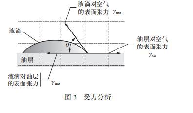 液滴爆炸現(xiàn)象的第二階段邊緣處的液滴產(chǎn)生液滴噴發(fā)現(xiàn)象,在該過程中液滴中部較厚的部分不斷向邊緣輸送液體,因此會穩(wěn)定持續(xù)一段時間。為解釋這一階段,先從表面張力入手,因為接觸角的不同,水對油的表面張力大于乙醇對油的表面張力,則混合液體對油層的界面張力介于水和乙醇之間?;旌弦旱沃幸掖嫉谋壤酱?,混合液體對油層的界面張力越小,受到向內(nèi)的張力減小,這樣整體向外的張力增大,這是產(chǎn)生向外推動的驅(qū)動力的重要原因??梢娊缑鎻埩χ苯記Q定了液滴在界面上的擴散和運動。