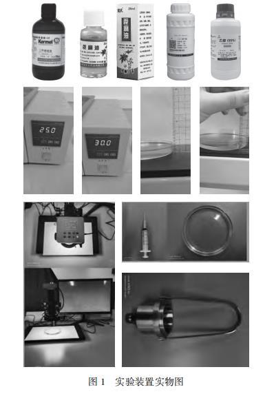為了還原物理現(xiàn)象,初步探究液滴爆炸的原因,本文首先進行了預(yù)實驗。實驗中所用到的物品包括:醫(yī)用75%酒精和蒸餾水混合形成水混合物液滴,家用菜籽油用作油池,普通藍墨水染色。在室溫環(huán)境下進行實驗,預(yù)實驗中發(fā)現(xiàn)普通藍墨水染色現(xiàn)象不明顯,改進為采用甲基藍染色劑進行染色。正式實驗時準備了不同種類的水混合物(乙醇、二乙二醇丁醚),不同種類的疏水性物質(zhì)(硅油、花生油、蓖麻油),不同厚度的疏水性物質(zhì)(5 mm、10 mm),設(shè)置合適的濃度梯度,采用恒溫水浴鍋來測定溫度。在顯微鏡下觀察液滴的運動過程,精準測定液滴大小,利用注射器定量控制滴入液滴的體積,再利用黏度計測量黏性系數(shù),并對實驗誤差進行了修正。