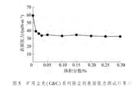 為了確定合理的表面活性劑添加濃度,分別選取了體積分?jǐn)?shù)為0.01%,0.02%,0.03%,0.05%,0.1%,0.15%,0.2%,0.25%,0.3%的礦用塵克(C&C)系列除塵劑進(jìn)行溶液表面張力測試,溶劑選用礦井水,測試儀器選用芬蘭Kibron EZ-Pi Plus便攜式動態(tài)表面張力儀,采用最大拉力法記錄圓環(huán)薄膜的拉伸破壞情況,從而計算出液體的表面張力。液滴表面張力越小,其與粉塵接觸后,更容易黏結(jié)沉降。測試結(jié)果如圖5所示。