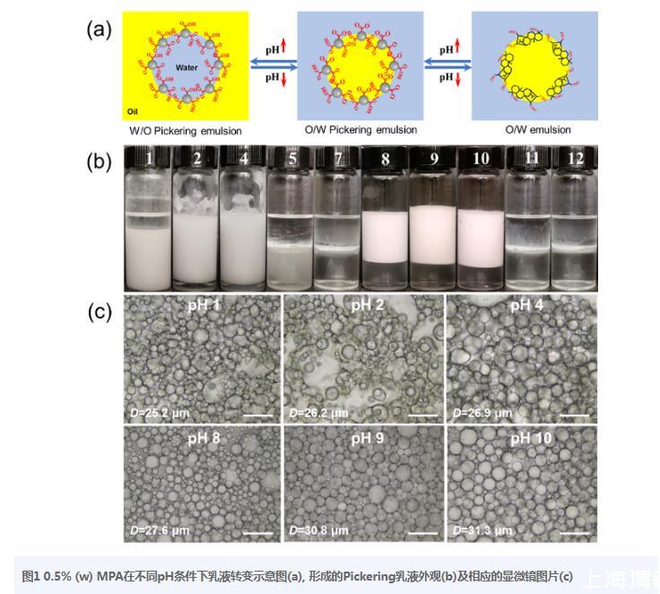 圖10.5%(w)MPA在不同pH條件下乳液轉(zhuǎn)變示意圖(a),形成的Pickering乳液外觀(b)及相應的顯微鏡圖片(c)