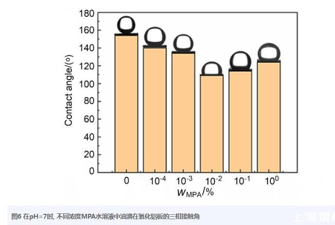 圖6在pH=7時(shí),不同濃度MPA水溶液中油滴在氧化鋁板的三相接觸角