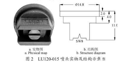 試驗噴頭為德國LECHLER公司生產(chǎn)的空氣誘導噴頭IDK120-025和多量程平面噴頭LU120-015,其結(jié)構(gòu)及尺寸如圖1和圖2所示。