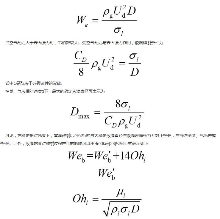 對于低黏度液體,當液滴處在穩(wěn)定氣流場中,其變形取決于空氣動力(0.5gd2,g是氣體密度,kg/m3;d是氣液流速差,m/s)和表面張力系數(shù)與液滴直徑比(1/)。