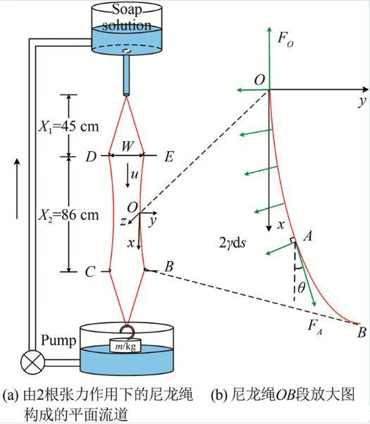 如圖1(a)所示,配制的皂液盛于上水箱中,經(jīng)一個狹長的出水管流出,進(jìn)入一個由兩根直徑為0.32 mm的尼龍繩構(gòu)成的豎直平面流道(實驗中,尼龍繩一直處于下方砝碼施加的張力作用下)。緊接出水管口的流道為漸擴(kuò)的擴(kuò)張段,其下為流道寬度不變的實驗段和流道逐漸收窄的收縮段(在本文實驗中,擴(kuò)張段長度X1=45 cm;實驗段長度X2=86 cm,實驗段入口寬度W=5 cm)。在擴(kuò)張段,皂液在重力驅(qū)動下加速,當(dāng)重力和空氣阻力平衡時充分發(fā)展,最終在實驗段達(dá)到勻速運動,之后經(jīng)收縮段流入下水箱,再被泵回至上水箱,形成往復(fù)循環(huán)。