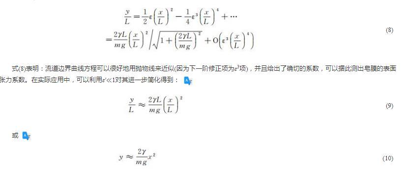 式(8)表明:流道邊界曲線方程可以很好地用拋物線來近似(因為下一階修正項為ε3項),并且給出了確切的系數(shù),可以據(jù)此測出皂膜的表面張力系數(shù)。在實際應用中,可以利用ε′?1對其進一步簡化得到: