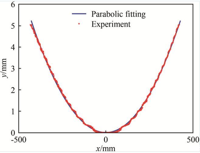 為驗證曲線方程(10),在砝碼質(zhì)量m=0.2 kg、皂液流量Q=35 mL/min時,實測了穩(wěn)態(tài)流動皂膜狀態(tài)下尼龍繩的位置坐標,如圖2中的離散點所示。尼龍繩位置通過照相得到,為獲得較大范圍內(nèi)的圖像,采用的放大倍數(shù)為1個像素對應0.35 mm的物理尺寸。對尼龍繩圖像在水平方向的光強分布進行高斯函數(shù)擬合以獲得亞像素的定位精度。圖2中的光滑曲線是采用式(10)進行擬合的結(jié)果,與實測曲線吻合良好,驗證了分析的正確性。利用已知的砝碼質(zhì)量,可以進一步得到表面張力系數(shù)γ=27.5 mN/m。值得注意的是:當砝碼質(zhì)量很小時,表面張力引起的流道收縮很大(在中點O處達到最大值12%),為避免由此帶來的流速和厚度場改變,在流動皂膜實驗中一般使用m=2 kg的砝碼。