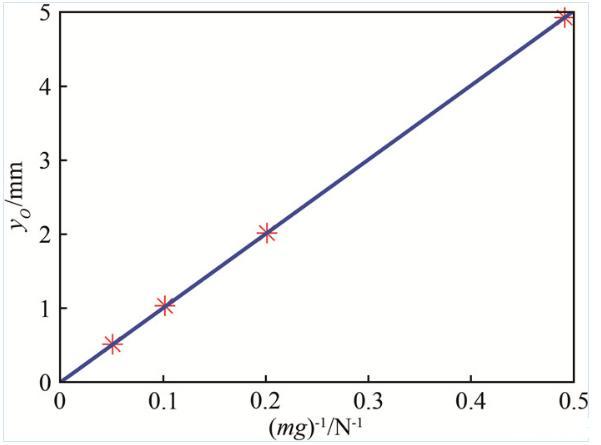 圖3給出了在同一皂液流量Q=35 mL/min下測得的流道中點O的位移隨砝碼質(zhì)量的變化以及根據(jù)式(11)擬合的直線。所有數(shù)據(jù)點都很好地落在過原點的擬合直線上,進一步驗證了本文推導的正確性。根據(jù)直線斜率測得的表面張力系數(shù)γ=27.1 mN/m,與前述拋物線擬合法得到的結(jié)果相近。