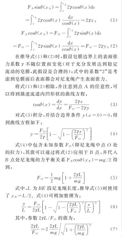 如圖1(a)所示,尼龍繩BE和CD下方懸掛質(zhì)量為m的砝碼以施加張力、保持流道穩(wěn)定。當沒有皂液流動時,尼龍線BE和CD在砝碼作用下保持鉛直;當皂液流入流道形成皂膜,尼龍繩BE和CD在皂膜表面張力的作用下向皂膜側(cè)略微收縮,形成微微內(nèi)凹的流道(圖中對內(nèi)凹程度有所放大)。從力平衡的角度出發(fā),推導出該內(nèi)凹曲線的形狀與皂膜表面張力系數(shù)的關系,可以給出一種測量流動皂膜表面張力系數(shù)的方法。