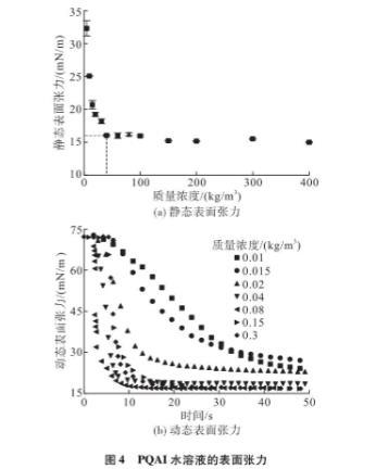 因此,本文采用芬蘭Kibron公司的表面張力儀在20一22℃下研究了溶液的界面性質(zhì),如靜態(tài)和動態(tài)表面張力。不同PQAI溶液的靜態(tài)表面張力的變化如圖4(a)所示。可以看出,在去離子水中加人少量表面活性劑,溶液的表面張力急劇下降。然而,在質(zhì)量濃度>0.04kg/m2時,下降趨勢開始緩慢。這意味著PQAI水溶液的pcMc~0.04kg/m2,此時表面活性劑水溶液靜態(tài)表面張力為16.07mN/m。