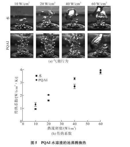 本文研究了PQAI溶液的池核沸騰換熱特性,試驗臺參數(shù)參考文獻(xiàn)。圖5顯示了PQAI溶液在臨界膠束濃度下的沸騰傳熱性能。與水相比,由于PQAI水溶液中表面張力的降低,沸騰時產(chǎn)生的氣泡數(shù)量顯著增加,氣泡半徑減小。此外,在低熱流密度下,可以明顯觀察到在氣泡脫離時氣泡聚結(jié)的趨勢減小,并且氣泡的形狀更接近球形。表面活性劑分子由極性親水頭和疏水性長尾組成。