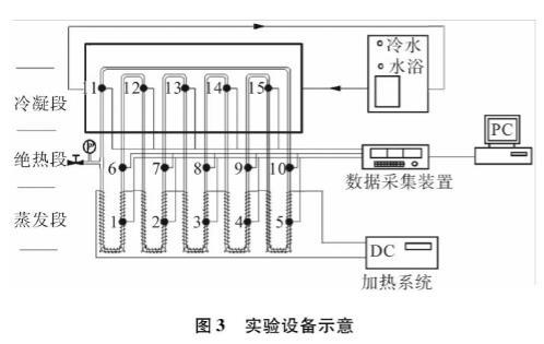 脈動熱管由外徑4 mm、內(nèi)徑2 mm,經(jīng)氧乙炔正火處理后銅毛細(xì)管彎曲而成。圖3示出了脈動熱管實驗設(shè)備的示意圖。用誤差傳播法分析了實驗裝置的不確定性。電壓電流精度為1%。本文中最小電壓和電流分別為17.9V和1.7A。此外,熱電偶的不確定度為0.1℃。在蒸發(fā)器和冷凝器的最小溫差為45℃時,熱阻的最大相對不確定度為4.47%。