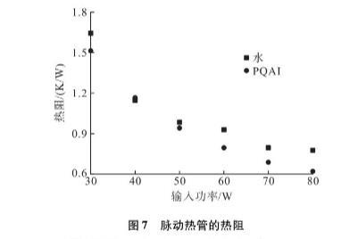 因此,表面張力較低的表面活性劑溶液在溶液中的毛細(xì)阻力較小,從而增強(qiáng)了溶液中的振蕩運(yùn)動(dòng)。圖7顯示了加人去離子水和PQAI水溶液脈動(dòng)熱管的熱阻。觀察到去離子水和PQAI溶液脈動(dòng)熱管的熱阻都隨著加熱功率的增加而減小。這意味著隨著加熱功率的增加,脈動(dòng)熱管中會(huì)有更劇烈的振蕩運(yùn)動(dòng)。此外,可以看出,在整個(gè)加熱功率下,PQAI脈動(dòng)熱管的熱阻低于去離子水的熱阻。在管道中,液塞和汽塞間隔排列。隨著蒸發(fā)段和冷凝段的壓差增大,工作流體發(fā)生振蕩運(yùn)動(dòng),進(jìn)一步實(shí)現(xiàn)傳熱。因此,振蕩運(yùn)動(dòng)對(duì)脈動(dòng)熱管的傳熱特性有很大的影響。研究表明熱量從蒸發(fā)段傳遞到冷凝段,主要是通過(guò)液塞在脈動(dòng)熱管中的振蕩運(yùn)動(dòng)來(lái)實(shí)現(xiàn)的。