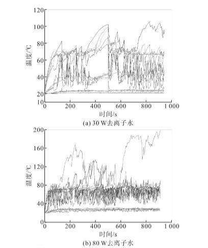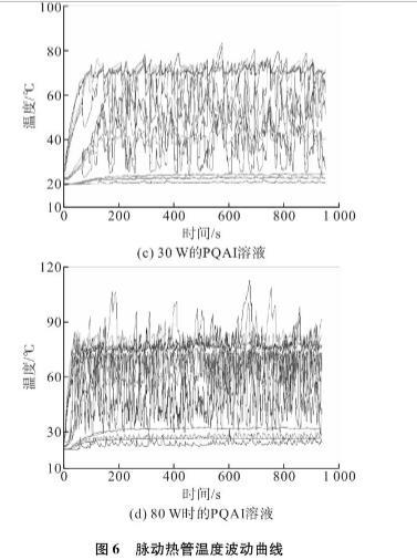 研究了充灌量對(duì)脈動(dòng)熱管運(yùn)行穩(wěn)定性和熱性能的影響,結(jié)果表明50%為最佳充灌率。因此,本文采用了50%的充灌率。圖6顯示了不同加熱功率下采用去離子水或PQAI水溶液脈動(dòng)熱管的溫度波動(dòng)曲線。