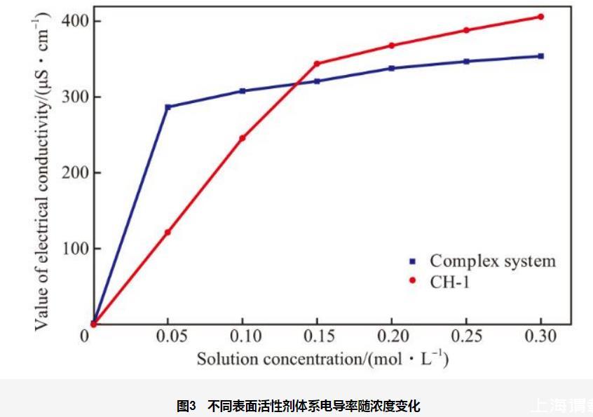 由圖3可看出,兩種表面活性劑的電導率均隨濃度的增加呈先迅速增大后緩慢增長的趨勢。這是因為表面活性劑濃度低于cmc時,表面活性劑主要以單體形式存在,單體中的離子可在溶液中自由移動,從而增加了溶液的導電能力;當表面活性劑濃度高于cmc時,一部分離子被包裹在膠束內部,使得自由移動的離子數(shù)量增加幅度減小,遠小于濃度低于cmc時電導率隨濃度增加的幅度。陽-非離子復合表面活性劑電導率轉折點時的濃度低于CH-1電導率轉折點時的濃度。這是因為復配后,離子型表面活性劑的離子頭基與非離子表面活性劑的極性頭基之間可通過靜電引力、離子-偶極等作用相結合。這種相互作用增強了表面活性劑分子在界面上的吸附能力和在溶液中的聚集能力,使得形成膠束所需的濃度降低,即cmc減小。