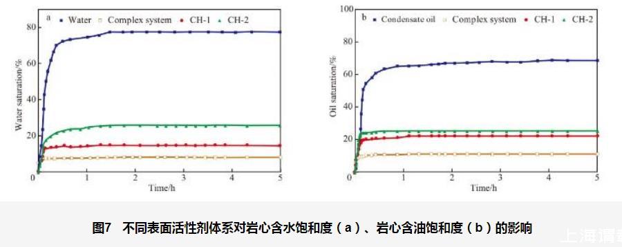 經(jīng)3種體系處理后,巖心的含水飽和度均降低,經(jīng)CH-1和CH-2處理過的巖心含水飽和度分別降至14.64%和25.79%,而經(jīng)陽-非離子復(fù)合表面活性劑體系處理后,巖心含水飽和度由77.4%降至8.10%。由圖7b可看出,未被表面活性劑處理的巖心在自發(fā)滲吸時(shí)間為0.5 h時(shí),巖心自發(fā)滲吸達(dá)到飽和,此時(shí)巖心含油飽和度增至68.90%。巖心經(jīng)3種體系處理后,巖心的含油飽和度均降低,經(jīng)CH-1和CH-2處理過的巖心含油飽和度分別降至22.29%和25.53%,而經(jīng)陽-非離子復(fù)合表面活性劑體系處理后,巖心含油飽和度降至11.25%。