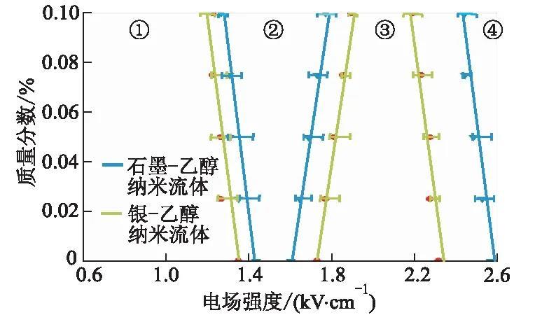 加入納米顆粒后τc/τH的變化如表1所示。納米顆粒的加入使得τc/τH逐漸升高并更接近于1,這表明納米顆粒的加入讓流體表面毛細波受到表面電荷遷移的阻尼逐漸升高,加速了流體由滴狀模式向紡錘模式的轉(zhuǎn)變,使得模式轉(zhuǎn)變所需臨界電場強度逐漸降低。在質(zhì)量分?jǐn)?shù)相同時,石墨~乙醇納米流體的τc/τH始終小于銀~乙醇納米流體的τc/τH,因此,由滴狀模式進入紡錘模式時石墨~乙醇納米流體所需電場強度更高(圖2區(qū)間①→②)。