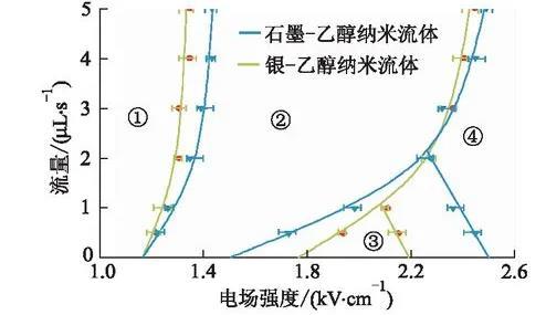 流量是影響納米流體霧化特性的另一重要參數(shù)。尋找在較大流量下依然能保持穩(wěn)定霧化效果的區(qū)間,對工業(yè)應(yīng)用具有十分重要的意義。質(zhì)量分?jǐn)?shù)為0.1%的納米流體在不同流量下霧化模式隨電壓的變化區(qū)間如圖3所示,區(qū)間①為滴狀模式,區(qū)間②為紡錘模式,區(qū)間③為錐射流模式,區(qū)間④為多股射流模式。相同電場強度下隨著流量的增加,單位體積流體荷電量也隨之減小。因此,流體從滴狀模式進入紡錘模式所需電場強度逐漸升高(圖3區(qū)間①→②)。由圖3區(qū)間②可知,隨著流量的增大紡錘模式所占區(qū)間逐漸增大。低流速(<2μL·s-1)狀態(tài)下,電場強度增大,流體表面集聚大量電荷,致使液體表面張力降低,霧化模式也就從紡錘模式逐步向錐射流模式過渡(圖3區(qū)間②→③)。納米流體的錐射流模式僅僅發(fā)生在流量低于2μL·s-1時,并且隨著流量的增大,錐射流模式所在區(qū)間迅速減小直至消失(圖3區(qū)間③)。電場對流體荷電的能力有限,流量的增加使得流體不穩(wěn)定性增大,大部分電荷無法聚集至液錐表面,從而導(dǎo)致錐射流模式隨著流量的增大,其霧化區(qū)間迅速消失。