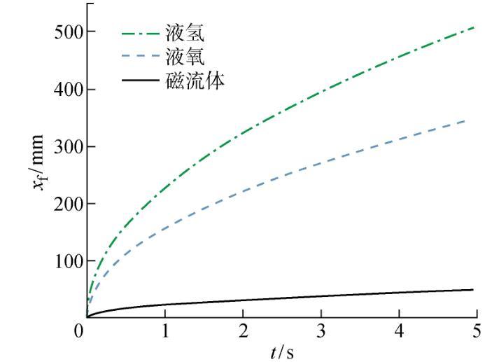 圖2為在τ=0.1,R=6×10-3m,α=15°的內(nèi)角條件下,液氫、液氧以及磁流體的毛細(xì)爬升距離隨時(shí)間的變化曲線。由圖可見(jiàn),液氫與液氧的流動(dòng)速度均顯著高于前文實(shí)驗(yàn)中的磁流體,且液氫的運(yùn)動(dòng)速度高于液氧。其原因在于盡管低溫推進(jìn)劑的表面張力較小,但由于其黏滯系數(shù)同樣較小,因子σ/μ反而增大;且上述兩種流體對(duì)不銹鋼有很好的潤(rùn)濕效果,最終導(dǎo)致爬升能力的提高。此外,對(duì)于上述兩種低溫推進(jìn)劑,液氫的表面張力以及黏度均小于液氧,但由于黏度對(duì)流動(dòng)的作用更顯著,所以液氫的運(yùn)動(dòng)速度始終高于液氧。