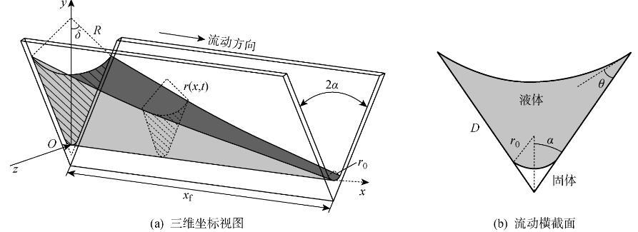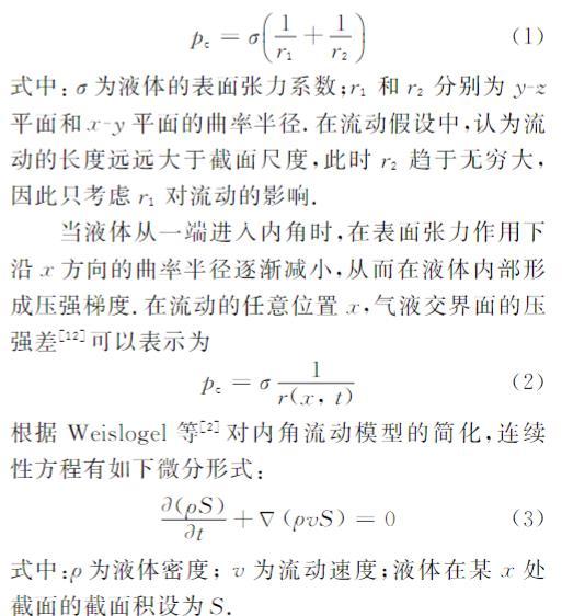 當(dāng)液體從一端進(jìn)入內(nèi)角時(shí),在表面張力作用下沿x方向的曲率半徑逐漸減小,從而在液體內(nèi)部形成壓強(qiáng)梯度。在流動(dòng)的任意位置x,氣液交界面的壓強(qiáng)差可以表示為