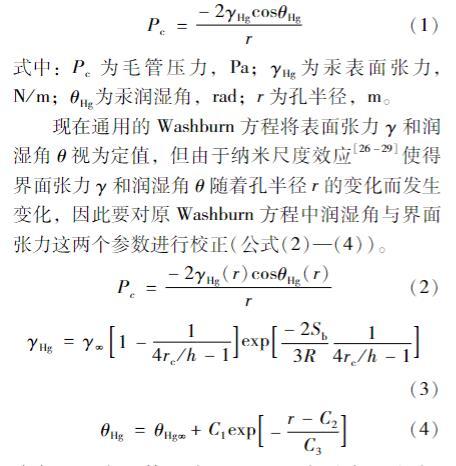式中:Pc為毛管壓力,Pa;γHg為汞表面張力,N/m;θHg為汞潤(rùn)濕角,rad;r為孔半徑,m;γ∞為孔半徑無(wú)窮大時(shí)汞的表面張力,γ∞=480 mN/m;θHg∞為孔半徑無(wú)窮大時(shí)汞的潤(rùn)濕角(θHg∞=140°);Sb為吸附熱,Sb=Eo/Tb=93.99 J/(mol·k),Eo為蒸發(fā)焓,Tb為沸點(diǎn);R為理想氣體常數(shù),R=8.314 J/(mol·k);h為有效分子或原子直徑,h=0.302 nm;rc為液滴曲率半徑,rc=-r/cosθ,nm;常數(shù)C1、C2、C3分別為18.345、1.719、2.711 7。