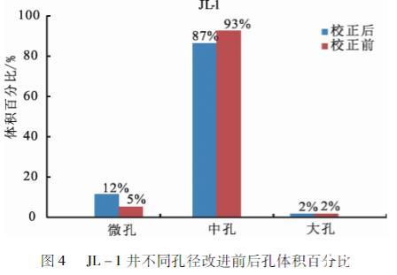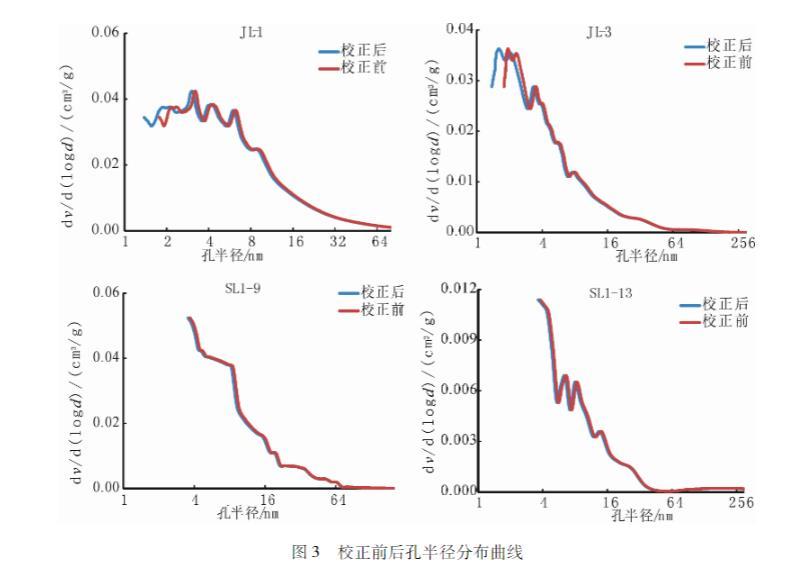 同樣應(yīng)用參數(shù)校正前后的Washburn方程對松遼盆地青山口組JL-1、JL-3、SL1-9、SL1-13井的泥頁巖樣品的數(shù)據(jù)處理、對比發(fā)現(xiàn)——參數(shù)校正后的方程對于半徑為4 nm以下的孔有較大的影響,對于半徑為4 nm以上的孔基本上沒有影響(圖3)。