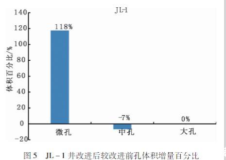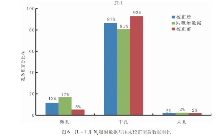用參數(shù)校正后的方程處理數(shù)據(jù)發(fā)現(xiàn)樣品微孔孔體積占比增加,較原始方程處理得到的結(jié)果增加了118%;而中孔孔體積占比減小,較原始方程處理得到的結(jié)果減小了7%;大孔孔體積占比不變。用改進(jìn)后的Washburn方程對松遼盆地青山口組JL-1、JL-3、SL1-9、SL1-13井的泥頁巖樣品的數(shù)據(jù)處理得出:該地區(qū)主要以微孔、中孔為主,發(fā)育有小部分大孔。統(tǒng)計(jì)壓汞實(shí)驗(yàn)數(shù)據(jù)發(fā)現(xiàn)微孔占比平均12%左右,中孔占比平均為86%,大孔占比平均為2%。依據(jù)實(shí)驗(yàn)數(shù)據(jù)評估,松遼盆地青山口組地區(qū)油氣主要儲集在中孔里面。因此,提高微小孔(<50 nm)烴源巖儲集層的勘探開發(fā)有十分重要的意義。
