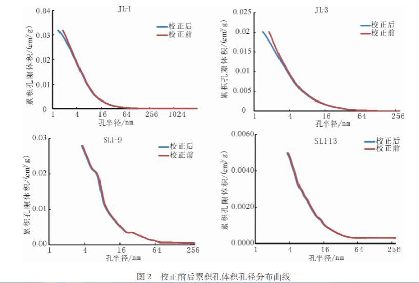 應(yīng)用參數(shù)校正前后的Washburn方程對松遼盆地青山口組JL-1、JL-3、SL1-9、SL1-13井的泥頁巖樣品壓汞數(shù)據(jù)處理得到累積孔體積的孔半徑分布曲線,分析發(fā)現(xiàn):參數(shù)校正后的方程對于微小孔的影響較大,在孔半徑小于4 nm時(shí),校正前后的兩條曲線出現(xiàn)明顯的不重合(圖2)。