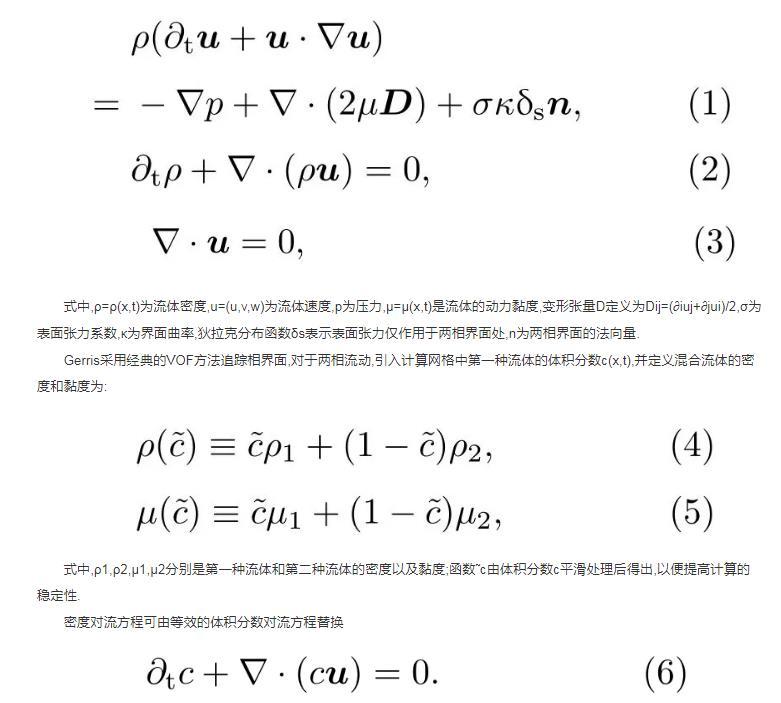 式中,ρ1,ρ2,μ1,μ2分別是第一種流體和第二種流體的密度以及黏度;函數(shù)?c由體積分?jǐn)?shù)c平滑處理后得出,以便提高計(jì)算的穩(wěn)定性。