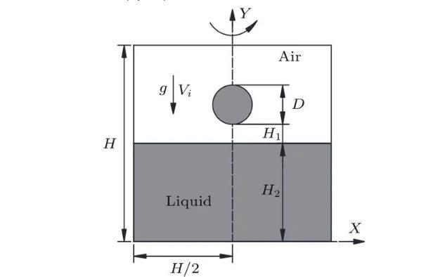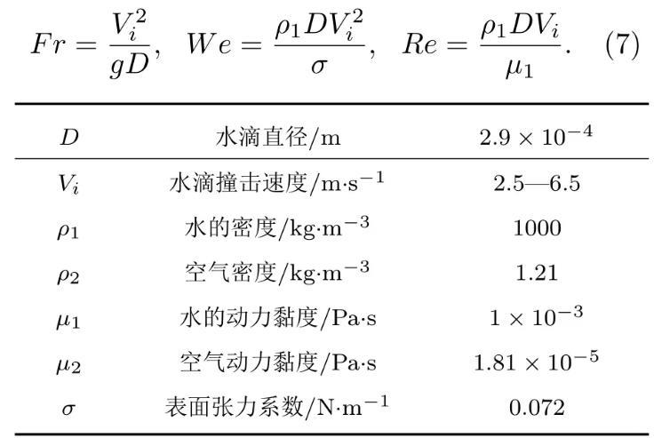 如圖1所示,水滴撞擊深水液池的數(shù)值模擬在軸對(duì)稱坐標(biāo)系中進(jìn)行,Y軸為計(jì)算區(qū)域的對(duì)稱軸,D為初始水滴直徑,R=D/2,正方形計(jì)算區(qū)域的長(zhǎng)度H=20D,水滴距離液面的距離H1=0.1D,液池深度H2=12D以消除底部對(duì)液滴撞擊運(yùn)動(dòng)的影響,水滴在重力g和撞擊速度Vi的作用下撞擊液池。采用雷諾數(shù)、韋伯?dāng)?shù)和弗勞德數(shù)來描述液滴撞擊的運(yùn)動(dòng)特征,三者分別表征液體慣性力與黏滯力間的關(guān)系、液體慣性力與表面張力間的關(guān)系以及液體慣性力與重力間的關(guān)系。三個(gè)無量綱參數(shù)的表達(dá)式如(7)式所示,主要物理參數(shù)如表1所列。