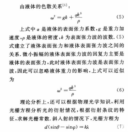 表面張力系數(shù)是液體的一個重要參量,測量液體表面張力的方法有吊環(huán)法、拉脫法等,這些都是基于力學(xué)平衡來測量液體的表面張力。光學(xué)測量技術(shù)具有快速、無損等特點(diǎn),所以自激光器發(fā)明以來,光學(xué)測量技術(shù)廣泛應(yīng)用于各種物理參量的測量,陜西師范大學(xué)苗潤才教授用激光干涉法測量液體的表面張力系數(shù),實(shí)現(xiàn)了液體表面張力系數(shù)的光學(xué)測量,并首次觀察到穩(wěn)定的液體表面張力波的激光衍射現(xiàn)象。我們嘗試用激光衍射法測量了液體表面張力系數(shù),實(shí)驗(yàn)采集了清晰、穩(wěn)定的液體表面張力波的激光衍射圖樣,建立一種液體的表面張力系數(shù)測量的光學(xué)測量方法,此方法具有非接觸、無損的特點(diǎn)。