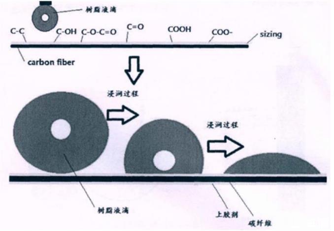 樹脂對碳纖維表面的浸潤性影響因素有很多。碳纖維表面的比表面積的大小,碳纖維表面的溝槽結(jié)構(gòu)或纖維表面的活性基團的數(shù)量和種類,均對碳纖維的浸潤性有影響。