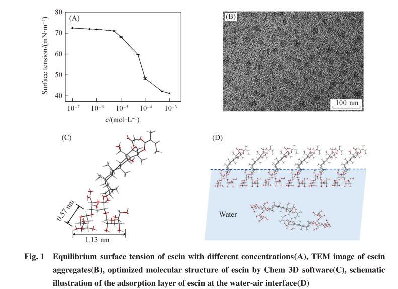 首先,采用吊片法測量了不同濃度七葉皂素溶液的表面張力.由于七葉皂素溶解度的限制,當(dāng)濃度超過1×10-3mol/L時會有少量固體物質(zhì)析出,影響測試結(jié)果,故表面活性測試的濃度范圍為1×10-7~1×10-3mol/L.如圖1(A)所示,隨著七葉皂素濃度的增加,表面張力呈現(xiàn)先基本不變、后快速下降、最后達到平衡的3個階段.這是由于濃度低于1×10-5mol/L時,只有少量七葉皂素分子吸附在氣-液界面,表面張力基本不變;然后隨著濃度增加,越來越多的分子遷移并吸附在氣-液界面,使溶液表面張力快速下降;當(dāng)分子在界面吸附達到飽和(5×10-4mol/L)后,開始在體相聚集形成膠束,表面張力不再改變.可知,七葉皂素的臨界膠束濃度(cmc)為5×10-4mol/L,對應(yīng)的表面張力(γcmc)為42.1 mN/m.圖1(B)為七葉皂素形成聚集體的TEM照片,膠束大小約為20 nm.