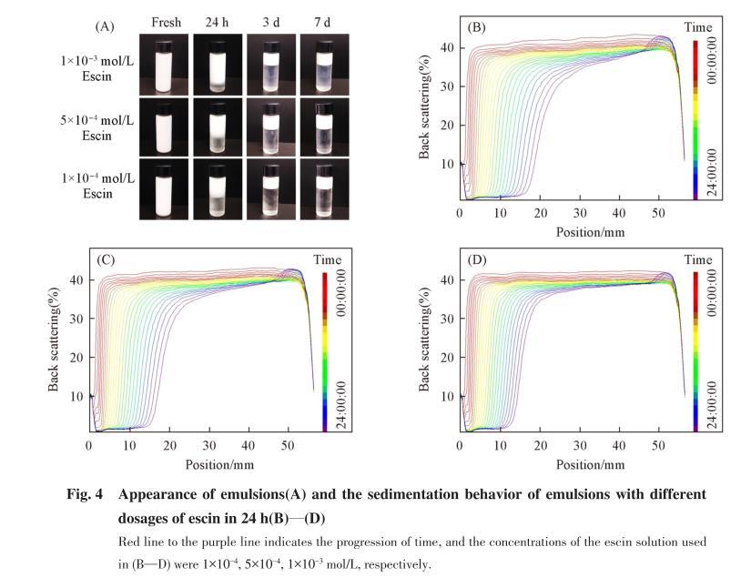 根據(jù)分散體系的光散射原理,當(dāng)光線射向乳液樣品時,會發(fā)生散射,通過儀器由乳液底部到頂部掃描檢測背散射光的強度,即可快速分析乳液的聚結(jié)、分層等現(xiàn)象。據(jù)此,采用MS20型乳液穩(wěn)定性分析儀測定了不同濃度七葉皂素乳液在24 h內(nèi)的穩(wěn)定性,如圖4(B)~(D)所示.隨著時間延長,乳液下半部分背散射率呈明顯減小趨勢,同時頂部背散射率逐漸增大,反映了下層析水,油相上浮的分層問題.而隨著七葉皂素濃度增加,下部背散射率的變化值明顯減小。