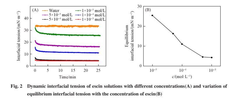 使用視頻光學(xué)接觸角測量儀,利用懸滴法測定溶劑油150#和不同濃度七葉皂素溶液的油-水界面張力.溶液為內(nèi)相,溶劑油150#為外相.將七葉皂素溶液置于氣密性良好的注射器(針管外徑為1.65 mm)中,利用步進馬達將溶液(8μL)注射到裝有溶劑油150#的玻璃皿中,CCD攝像機同步記錄測定過程的液滴狀態(tài)(每次測定25 min),軟件通過液滴形狀分析計算出界面張力.分別測定超純水以及不同濃度七葉皂素溶液與溶劑油150#的界面張力,每個樣品重復(fù)測3次.