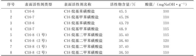 石油磺酸鹽具有降低油水界面張力、來源廣和價格低等優(yōu)勢,因而在三次采油中占有極其重要的地位。但同時由于它的未磺化油含量較高,造成低滲透油層的注入困難。烷基苯磺酸鹽是一種碳鏈長度固定、結(jié)構(gòu)相對單一的表面活性劑,其未磺化油含量相對較低,遠遠小于石油磺酸鹽。筆者通過配制弱堿三元復合體系評價其界面活性,試驗研究了烷基苯磺酸鹽結(jié)構(gòu)與界面活性的關(guān)系,旨在為弱堿三元復合驅(qū)優(yōu)選表面活性劑提供重要依據(jù)。