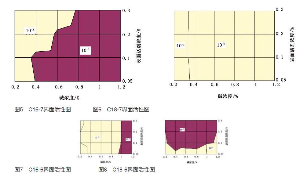 1)碳鏈長度對界面活性的影響對用濃度為1500mg/L的聚合物和不同碳鏈長度的烷基苯磺酸鹽配置的弱堿三元復合體系進行界面活性檢測(見圖5~圖8)。圖5和圖1對比表明,帶有支鏈的C16烷基苯磺酸鹽形成超低界面張力時堿濃度和表面活性劑濃度范圍較寬;圖6和圖4對比表明,帶有支鏈的C18烷基苯磺酸鹽在相同濃度范圍內(nèi)沒有形成超低界面張力。因此,帶有支鏈的C16烷基苯磺酸鹽界面活性好于帶有支鏈的C18烷基苯磺酸鹽。