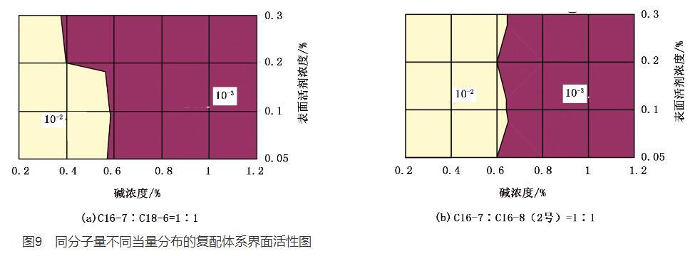 2)同分子量不同當(dāng)量分布的表面活性劑界面活性范圍從圖8和圖2對比可以得出,表面活性劑平均相對分子量為432時(shí),C18-6測得表面活性劑與堿濃度范圍很寬的超低界面活性范圍,而C16-8(2號(hào))超低界面活性范圍的堿濃度相對于C18-6變窄。同理,在試驗(yàn)用表面活性劑的復(fù)配體系中,試驗(yàn)圖9表明平均相對分子量為425時(shí),C16-7與C18-6的復(fù)配體系形成超低界面活性范圍寬于C16-7與C16-8(2號(hào))的復(fù)配體系。說明平均相對分子量相同當(dāng)量分布不同的表面活性劑界面活性范圍也不相同。