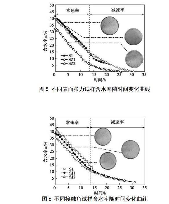 把篩好的土放入105℃烘箱內(nèi)烘至恒重備用。設(shè)計(jì)土樣的干密度為1.5 g/cm3,含水率計(jì)算不考慮酒精溶液和肥皂水引起的液體密度變化,制樣含水率為16%~18%。采用輕型擊實(shí)儀制圓柱試樣,試樣直徑為102 mm,高40 mm,試樣制好后用真空飽和法進(jìn)行飽和,其中,SZ1樣用20%酒精溶液飽和,SZ2樣用濃度為2 g/L的肥皂水飽和,其余試樣均為純水飽和,抽氣時(shí)間為6 h,試樣在真空下的浸泡時(shí)間為12 h。為縮短試樣的脫濕時(shí)間以減小酒精揮發(fā)造成的濃度降低,飽和試樣脫濕采用低溫烘干法,烘箱的溫度控制在50℃(小于酒精的沸點(diǎn)和十八胺的熔點(diǎn)),當(dāng)2h內(nèi)試樣的質(zhì)量變化量不超過(guò)2 g時(shí)停止試驗(yàn)。試驗(yàn)開(kāi)始后,前8 h每隔30 min把試樣從烘箱中取出后先稱(chēng)重,隨后進(jìn)行拍照記錄,稱(chēng)重和拍照的時(shí)間控制在30s內(nèi),拍照結(jié)束后把試樣放入烘箱繼續(xù)脫濕,6 h以后拍照間隔時(shí)間增加為1 h。2試驗(yàn)結(jié)果2.1水分蒸發(fā)與臨界含水率圖5給出了不同表面張力的3種試樣含水率隨時(shí)間變化的關(guān)系曲線。